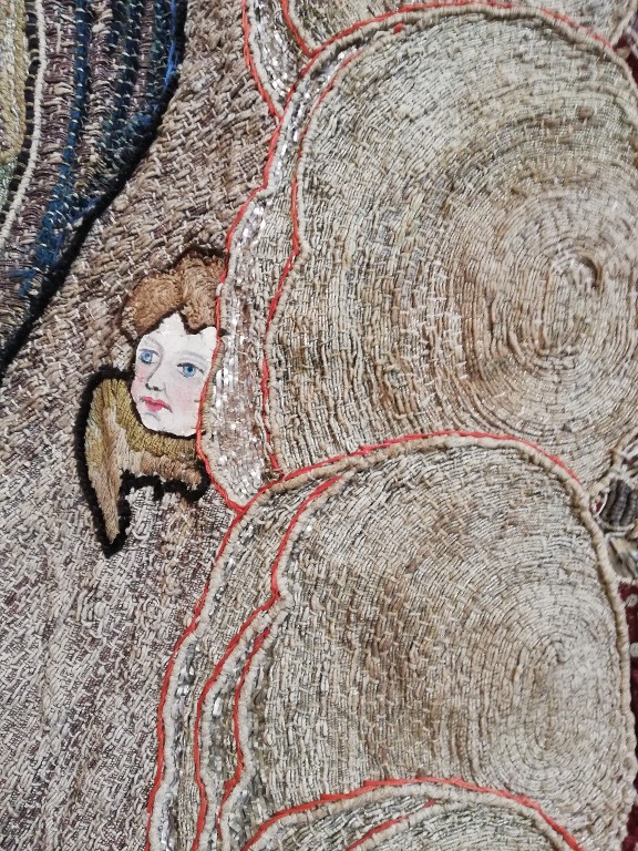 Détail : visage d'ange peint dans les nuées de couchure spiraléeImmatriculation