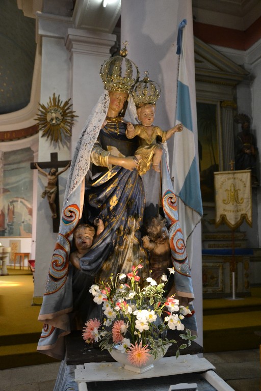 Vierge à l'enfant dite Notre-Dame des Fontaines, sur son brancard de procession, couronnes dorées, voile en dentelle, robe bleu, puttisImmatriculation