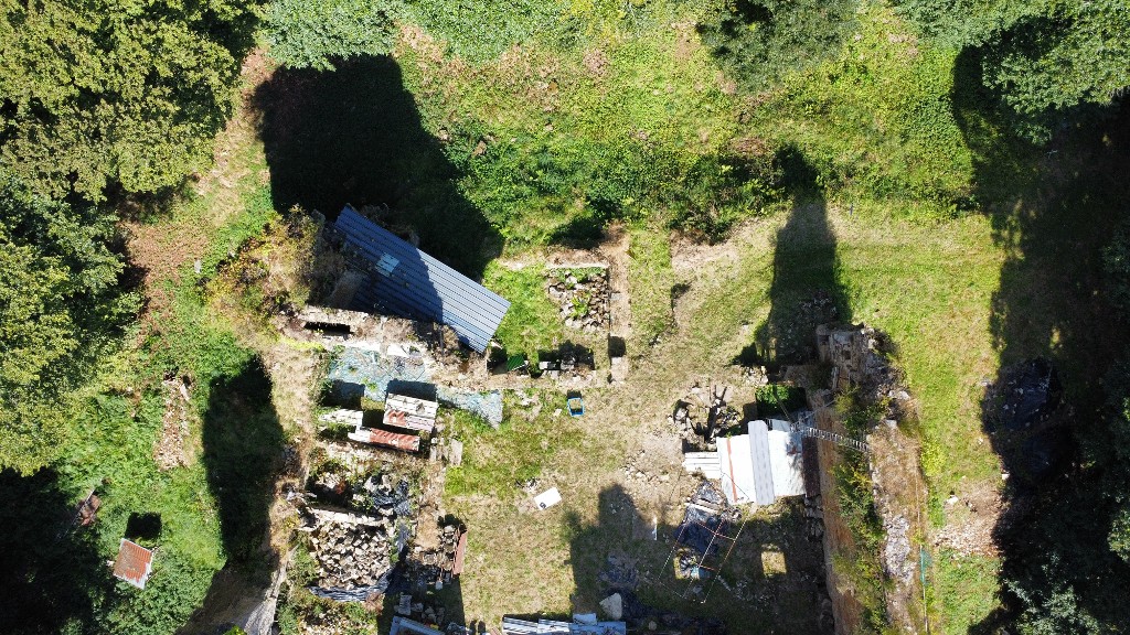 Vue aérienne verticale : logis-porche - châtelet nord. Son état est ruiniformeImmatriculation