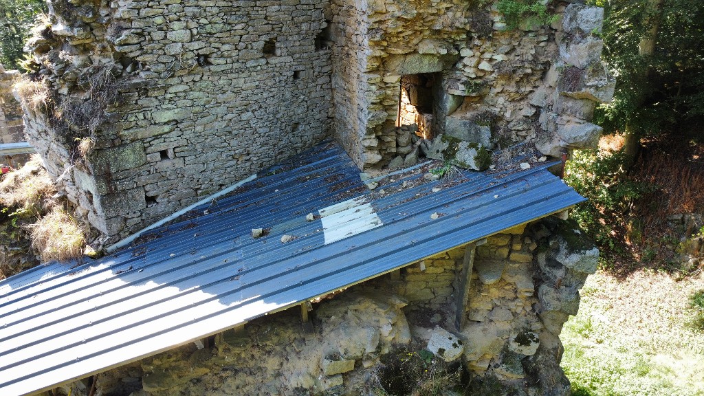 Vue aérienne oblique : liaison entre la tour du logis-porche - châtelet nord et la courtine ouest. La couverture en bac acier protège les maçonneries de la pluieImmatriculation