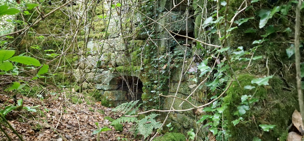 Vue de l'intérieur de la tour circulaire. Quoique envahie par la végétation, on distingue deux ouvertures de tirImmatriculation