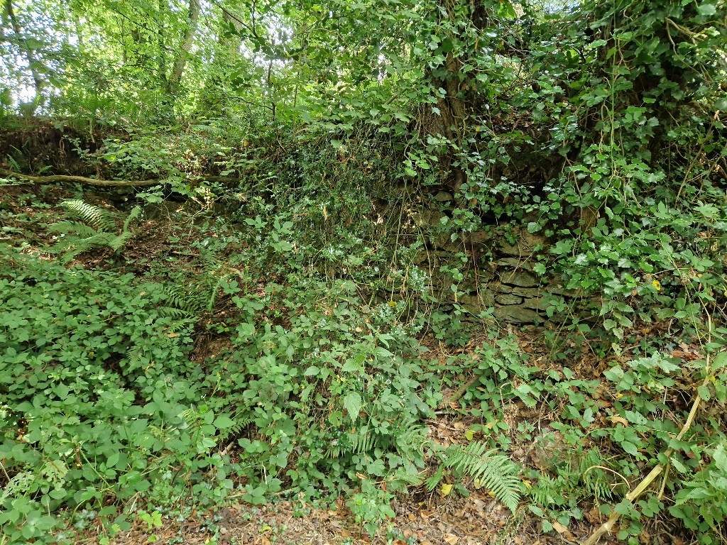 Vue de la contrescarpe au nord-ouest en maçonnerie de moellon. En mauvais état, elle est masquée par la végétationImmatriculation