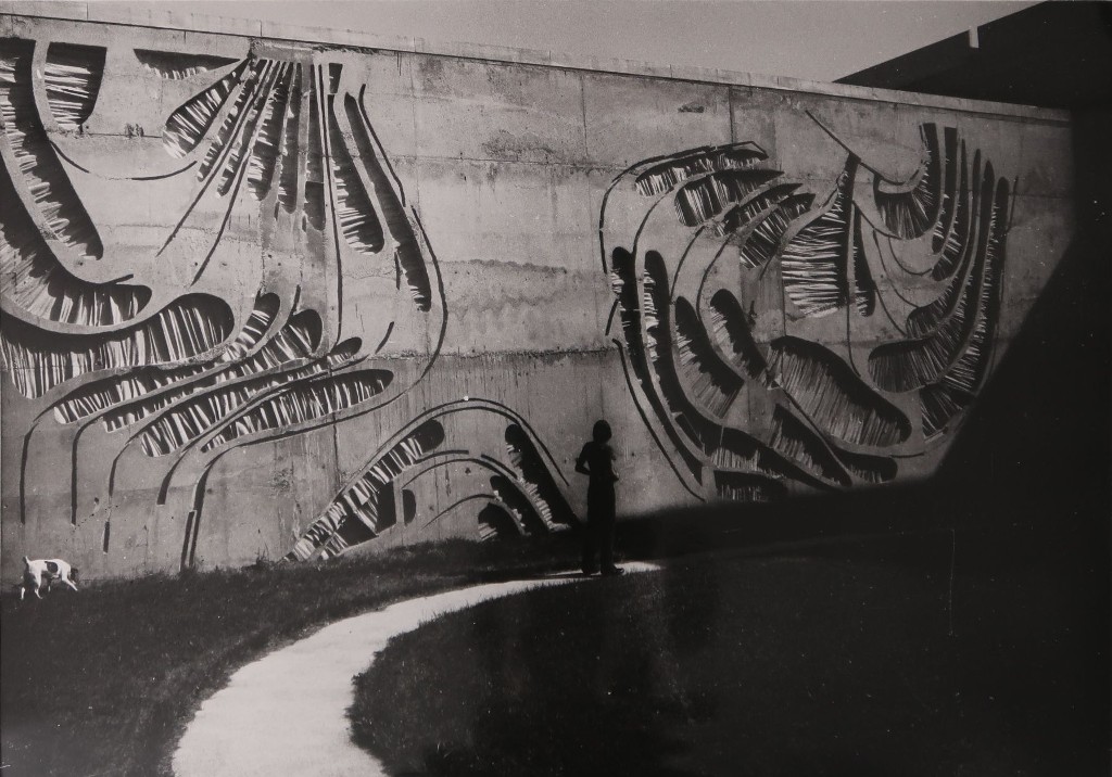 Mur sculpté par empreinte de polystyrène. Bernard Alleaume et Yvette Vincent-Alleaume, 1974-1975.Immatriculation