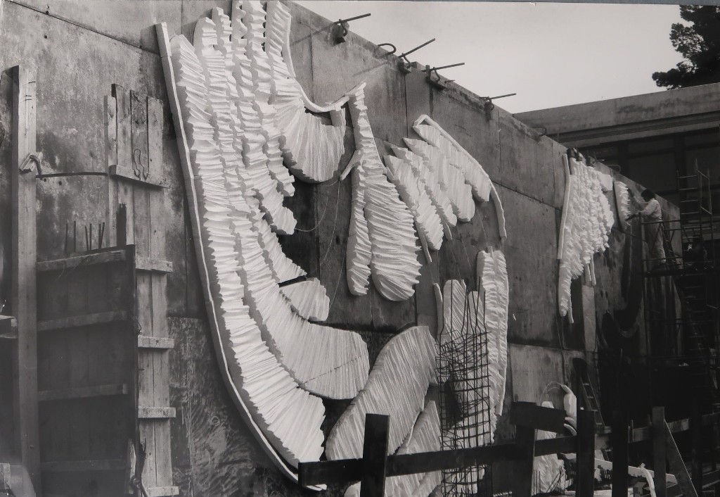 Chantier du mur sculpté par empreinte de polystyrène par Bernard Alleaume et Yvette Vincent-Alleaume, 1974.Immatriculation