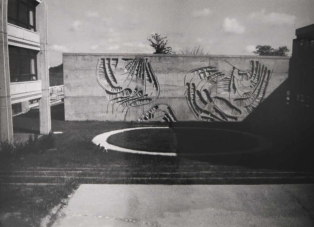 Mur sculpté par empreinte de polystyrène, gradins et scène. Bernard Alleaume et Yvette Vincent-Alleaume, 1974-1975.Immatriculation