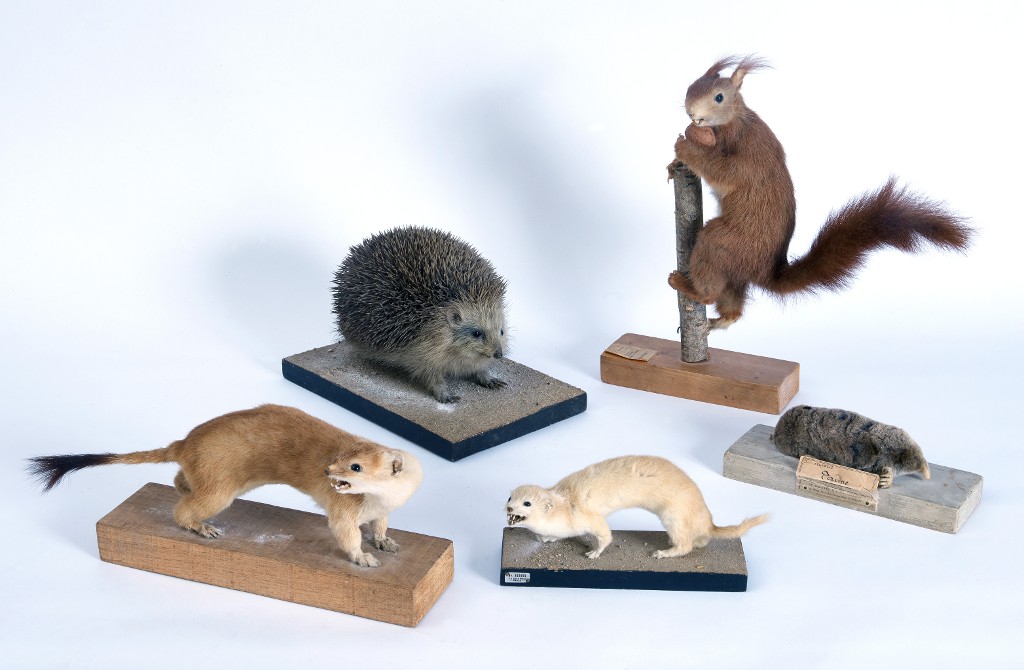 Collection de petits mammifères naturalisés (hérisson 1946, hermine, belette, écureuil, taupe 1962) acquis auprès de la maison Auzoux.Immatriculation