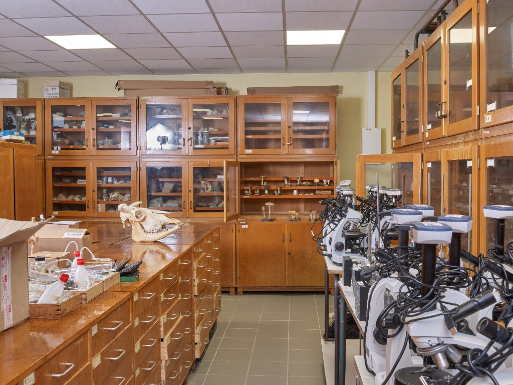 Vue partielle de la salle 105 utilisée pour stocker les collections naturalistes mais aussi le matériel des travaux pratiques de SVT.Immatriculation