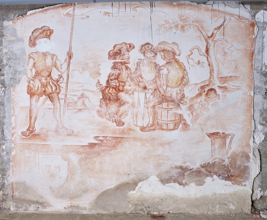 Vue générale de la peinture murale de la cave de la maison de notable. Elle a été réalisée sur le mur de protection de l'entrée du bunkerImmatriculation