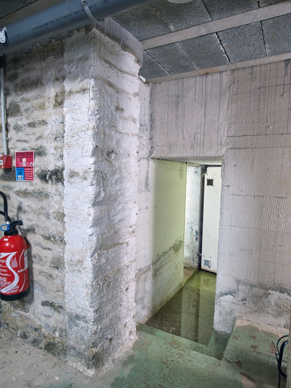 Vue de l'une des deux entrées du couloir d'accès du bunker depuis la cave de la maison de notable. La seconde entrée du couloir est murée par des parpaingsImmatriculation