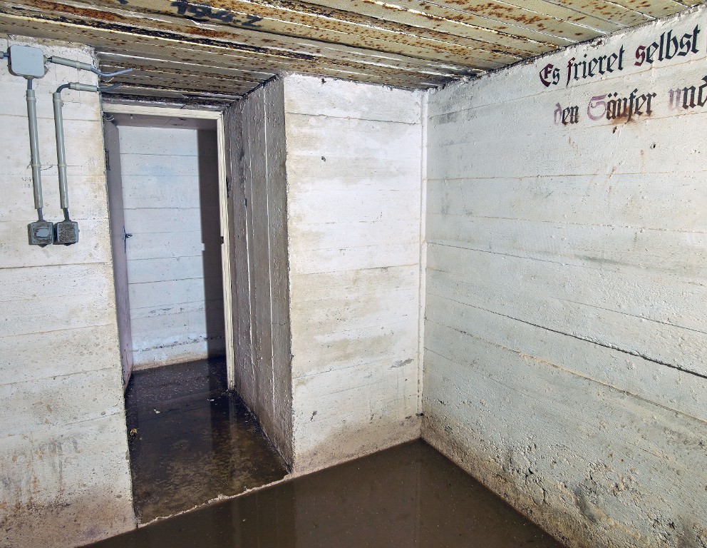 Vue intérieure du bunker : entrée. A droite, peinture muraleImmatriculation