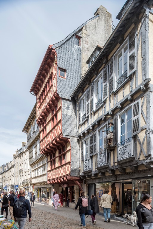 Maisons mitoyennes en pan de bois. Le 12 rue Kéréon marque le paysage urbain par l'ampleur des encorbellements successifs sur trois niveaux.Immatriculation