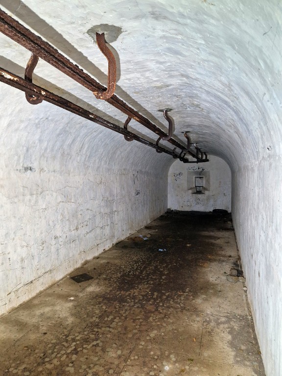 Vue intérieure du magasin à munitions : extrémité est avec créneau à lampe, fixations et rail pour la manutention des obus via un palanImmatriculation
