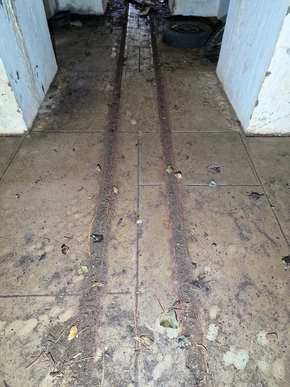 Vue intérieure du magasin à munitions : entrée est avec au sol une voie ferrée de 40 cm d'écartement pour le transport des munitions sur wagonnet. Un palan prend ensuite le relai pour la manutention des obus via un palanImmatriculation