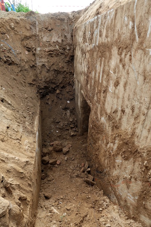 Vue de l'accès à l'entrée nord (creusé par une pelle mécanique hydraulique dans le cadre de l'opération de déminage). A gauche se trouve le mur de protection de la tranchée d'accèsImmatriculation
