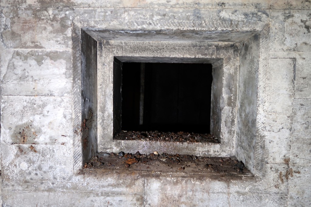 Vue du l'entrée nord : couloir d'accès flanqué par un créneau de tir. Le créneau blindé n'a pas été poséImmatriculation