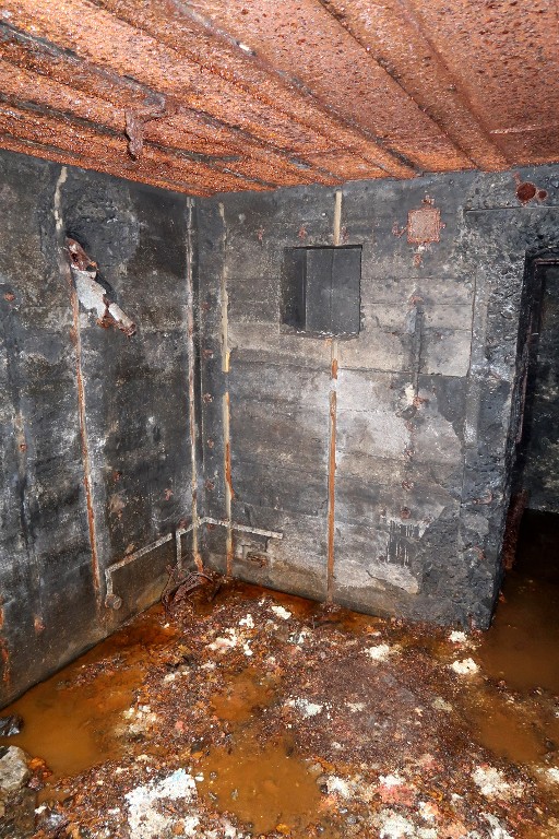 Vue intérieure : angle nord-est avec niche murale. Au sol, les arrivées de câbles téléphoniques du boîtier de connexion [disparu] qui était fixé au mur. Sur le mur nord se trouve peint le numéro du bunker : B 25 / 8Immatriculation