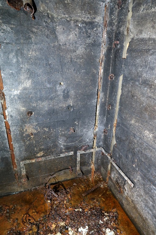Vue intérieure : angle nord-est. Au sol, les arrivées de câbles téléphoniques du boîtier de connexion [disparu] qui était fixé au mur. Sur le mur nord se trouve peint le numéro du bunker : B 25 / 8Immatriculation