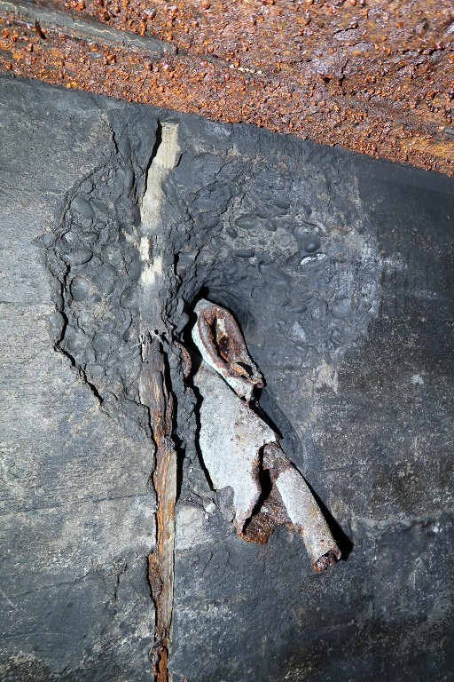 Vue intérieure : angle nord-est, tuyau d'arrivée d'eau ?Immatriculation