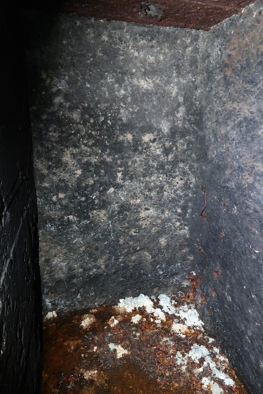 Vue de la petite pièce dédiée à l'usage du périscope. Cette pièce a servi de fourneau pour le désobusageImmatriculation