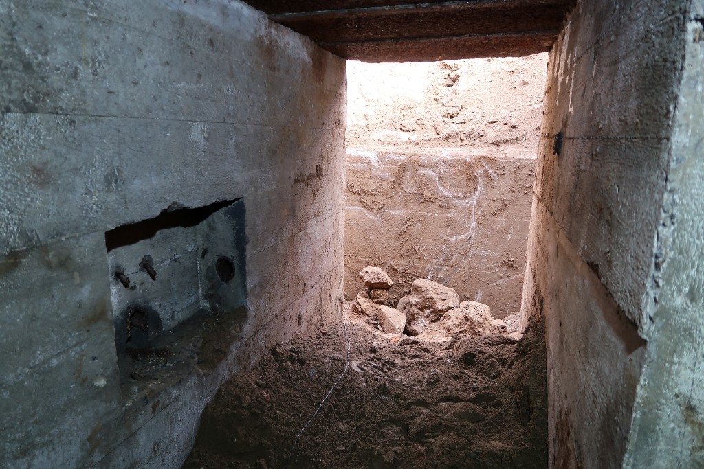 Vue de l'entrée nord [dans le sens de la sortie]. Sur le mur latéral se trouve une niche murale avec passage de câble et fixations. Au fond, le mur de protection en béton armé de la tranchée d'accèsImmatriculation