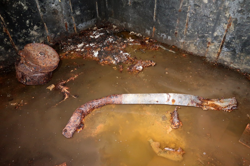 Vue de la salle de garde sud : au sol, baignant dans l'eau : tuyau de la ventilation et filtre à charbon du ventilateurImmatriculation