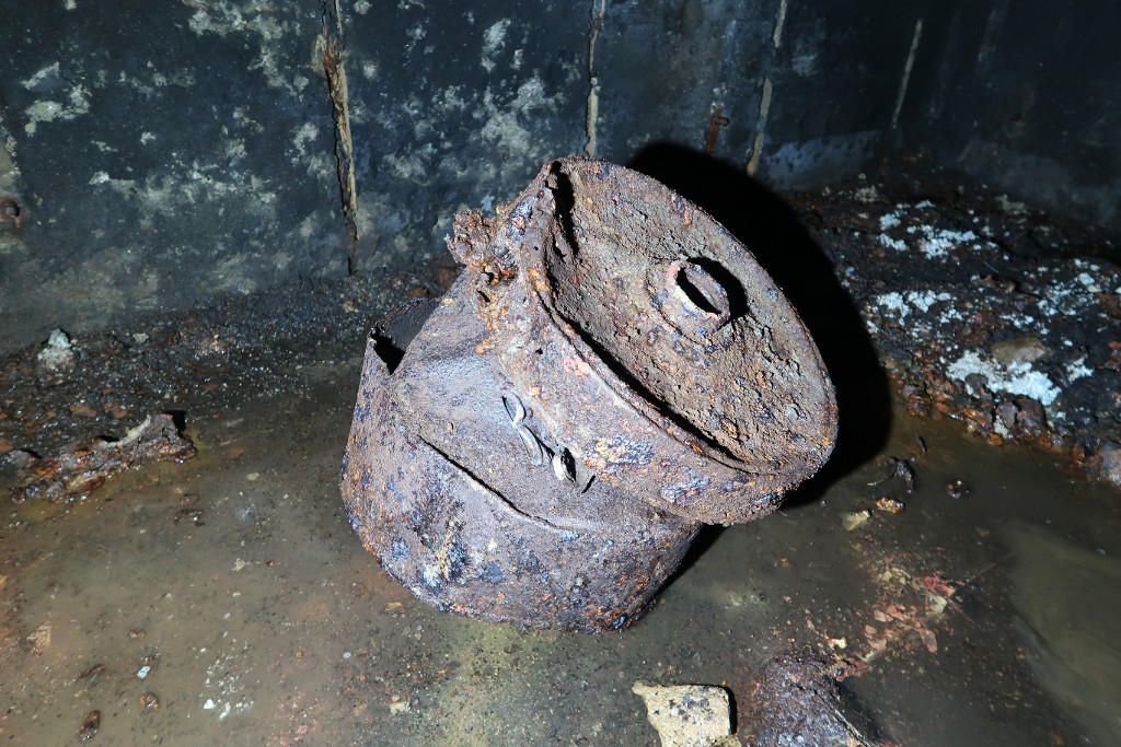 Vue de la salle de garde sud : au sol, baignant dans l'eau : filtre à charbon du ventilateurImmatriculation