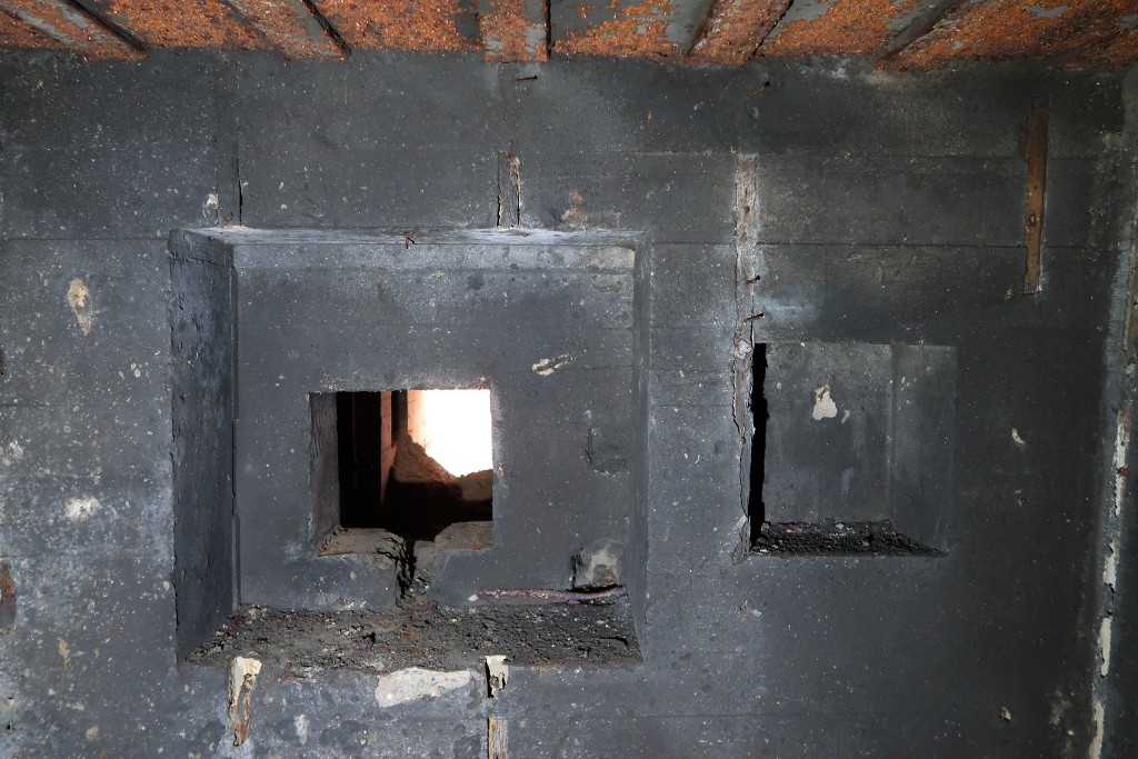 Vue de la salle de garde sud : créneau de tir et niche murale. Les murs sont constellés déclats et noircis par la fuméeImmatriculation