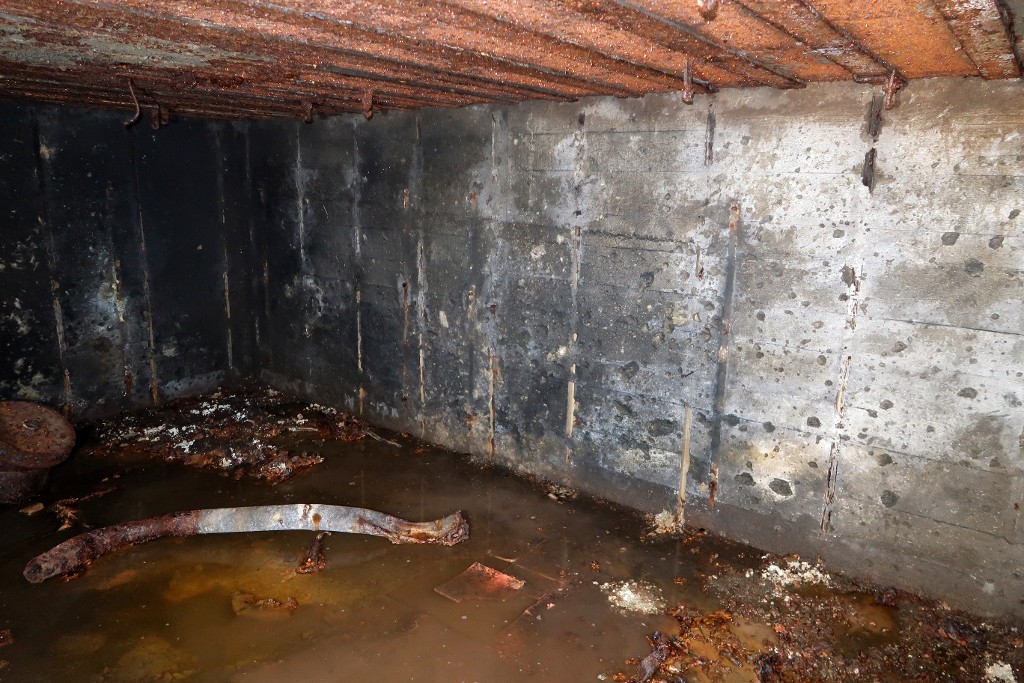 Vue de la salle de garde sud : les murs sont constellés déclats et noircis par la fumée. Au sol, baignant dans l'eau : tuyau de la ventilation et filtre à charbon du ventilateurImmatriculation