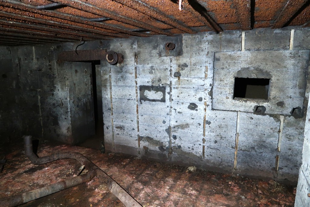 Vue de la salle de garde nord : accès de la petite salle, emplacement du ventilateur et créneau de tir. Les murs sont constellés déclats et noircis par la fumée. Le tuyau du système de ventilation gît au solImmatriculation