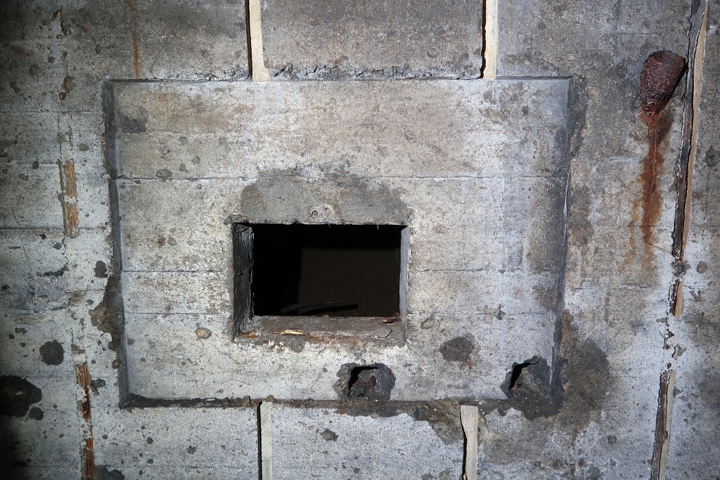 Vue de la salle de garde nord : créneau de tir. Les murs sont constellés déclats et noircis par la fuméeImmatriculation