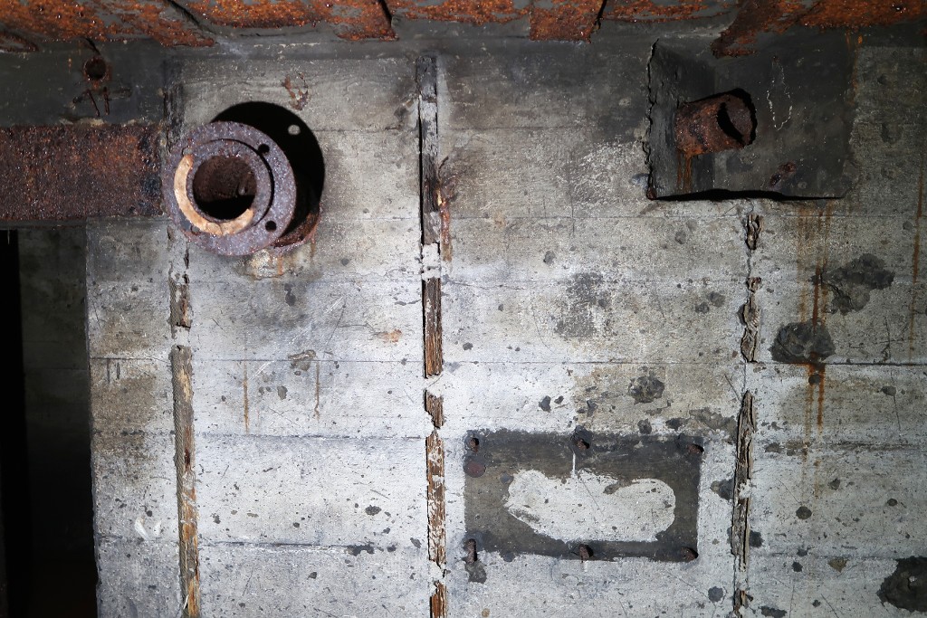 Vue de la salle de garde nord : emplacement du ventilateur. Les murs sont constellés déclats et noircis par la fuméeImmatriculation