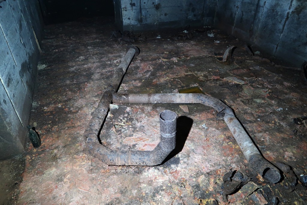Vue de la salle de garde nord : le sol est constitué de carreaux en terre cuite. Le tuyau du système de ventilation gît au solImmatriculation