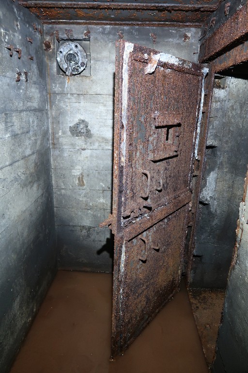 Vue de la petite salle située au nord-est : une porte blindée à deux vantaux lisole des salles de garde. Derrière la porte se trouve une bouche de soufflage (non visible) et une bouche de surpression à clapet à contrepoids en aluminiumImmatriculation
