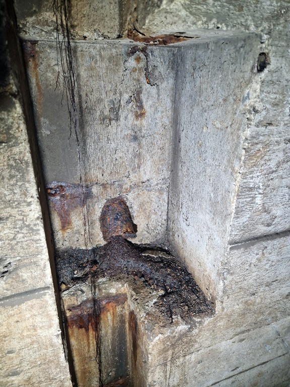 Vue de l'entrée nord : détail du passage d'antenne avec conduite de câble (pour l'alimentation électrique ?)Immatriculation