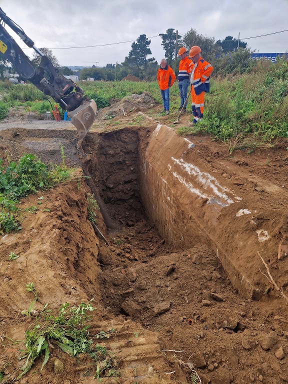 Vue des préparatifs de lintervention du centre de déminage de Brest dans les deux bunkers du lotissement Alfred Nakache (mercredi 11 octobre 2023). Une pelle mécanique hydraulique a été utilisée pour dégager l'un des deux accès au bunker nordImmatriculation