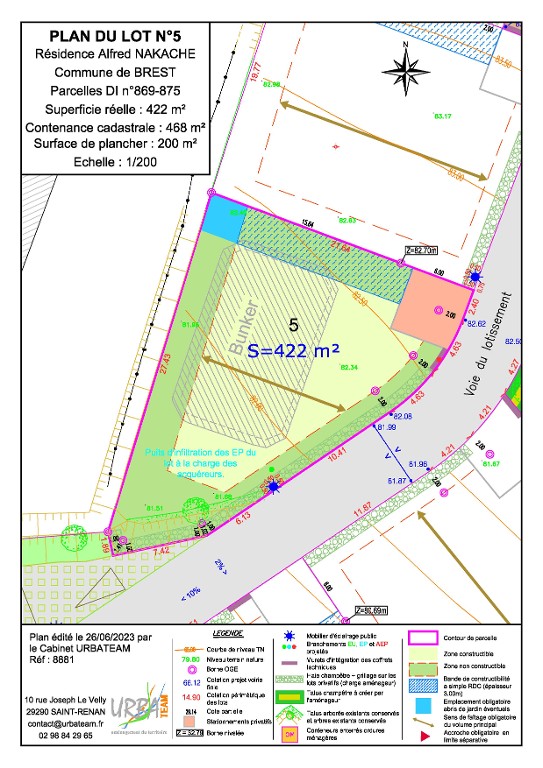 Plan du lot n° 5 du lotissement Alfred Nakache (aménageur : Nexity ; plan réalisé par le cabinet Urbateam à Saint-Renan, juin 2023). Le bunker sud est situé dans cette parcelleImmatriculation