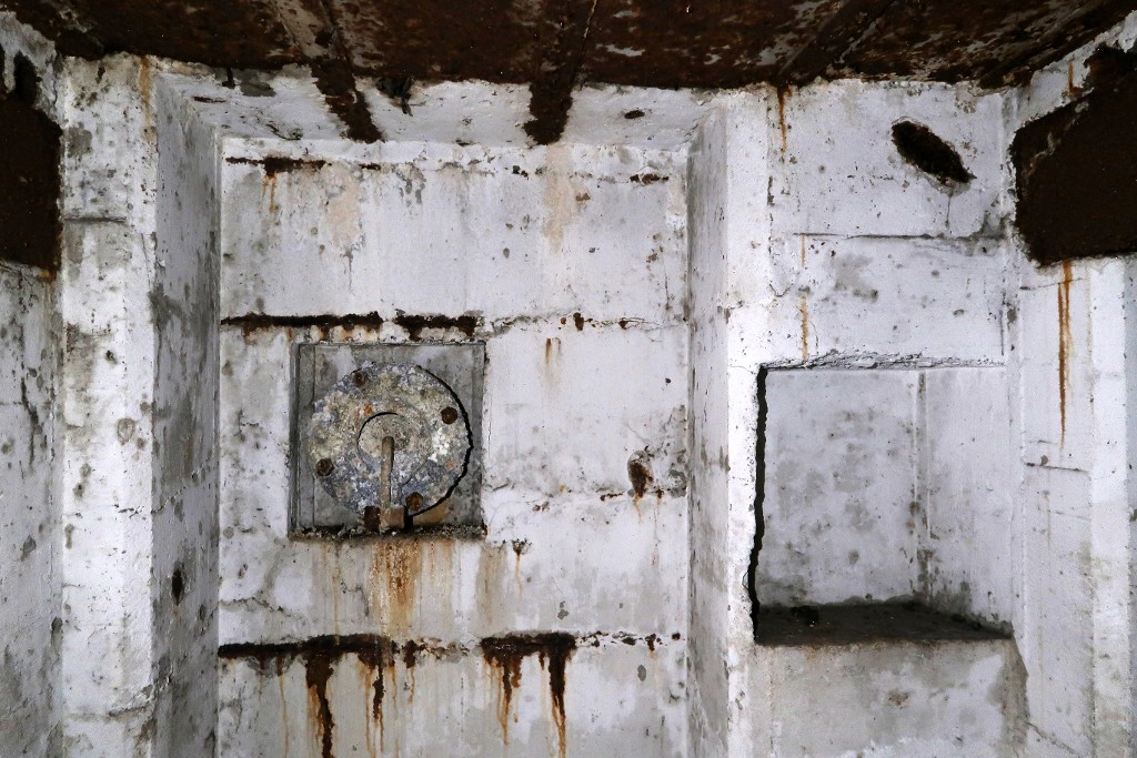 Vue du sas : mur est avec bouche de surpression à clapet à contrepoids en aluminium et niche murale. De part et d'autre se trouvaient deux portes blindéesImmatriculation
