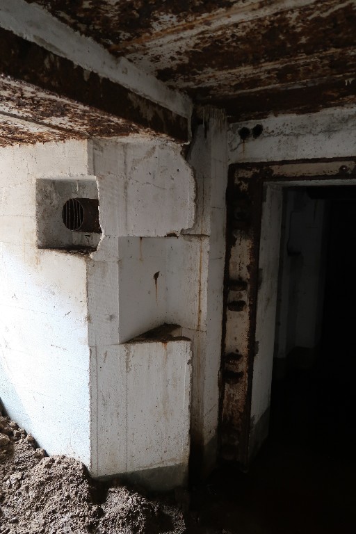 Vue du l'entrée nord : couloir d'accès au sas avec son pan coupé. Seule l'huisserie témoigne de la présence de la porte blindée (ferraillée). De part et d'autre du couloir, passages d'antenneImmatriculation