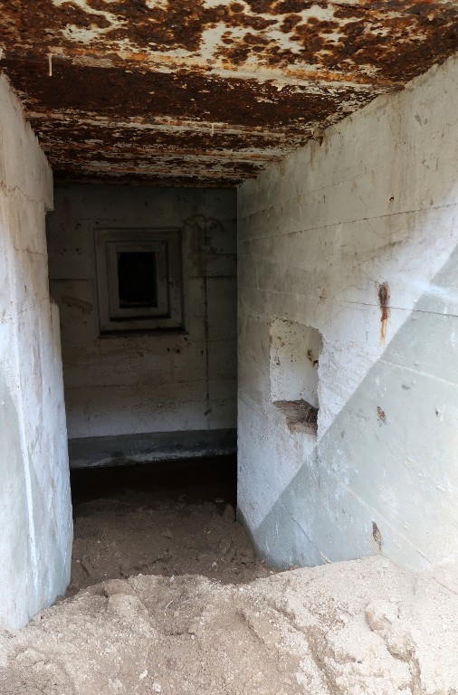 Vue du l'entrée nord : couloir d'accès avec niche murale flanqué par un créneau de tir. Sur les murs latéraux, peinture murale en biseau pour éviter le repérage de l'entrée du bunker depuis le cielImmatriculation