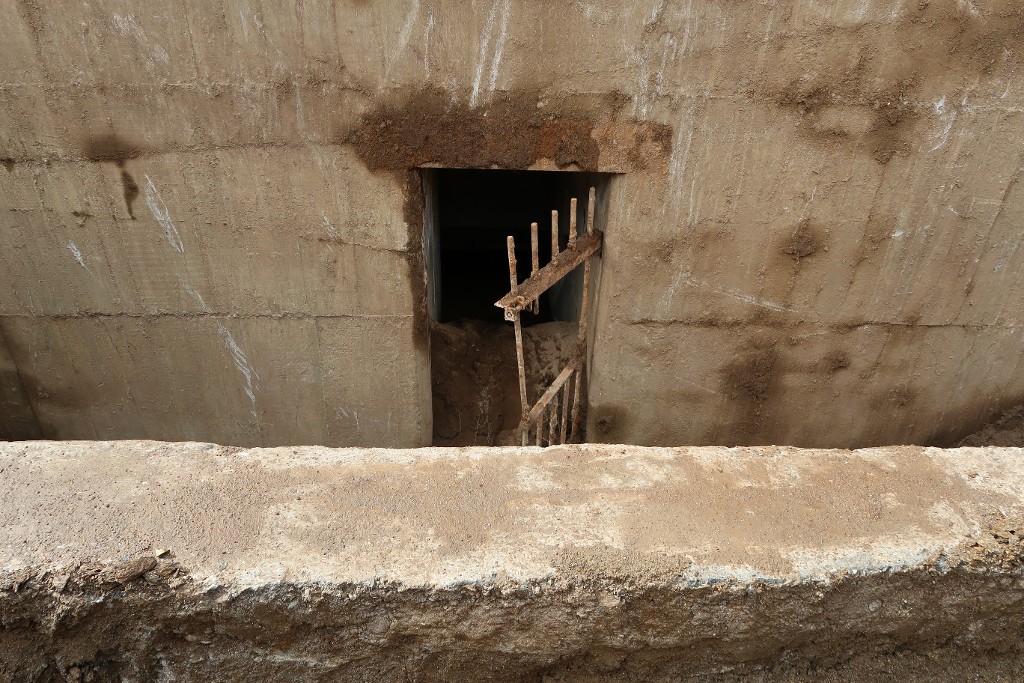 Vue de l'entrée nord avec sa grille de protection. Au premier plan, le mur de soutènement de la tranchée d'accèsImmatriculation