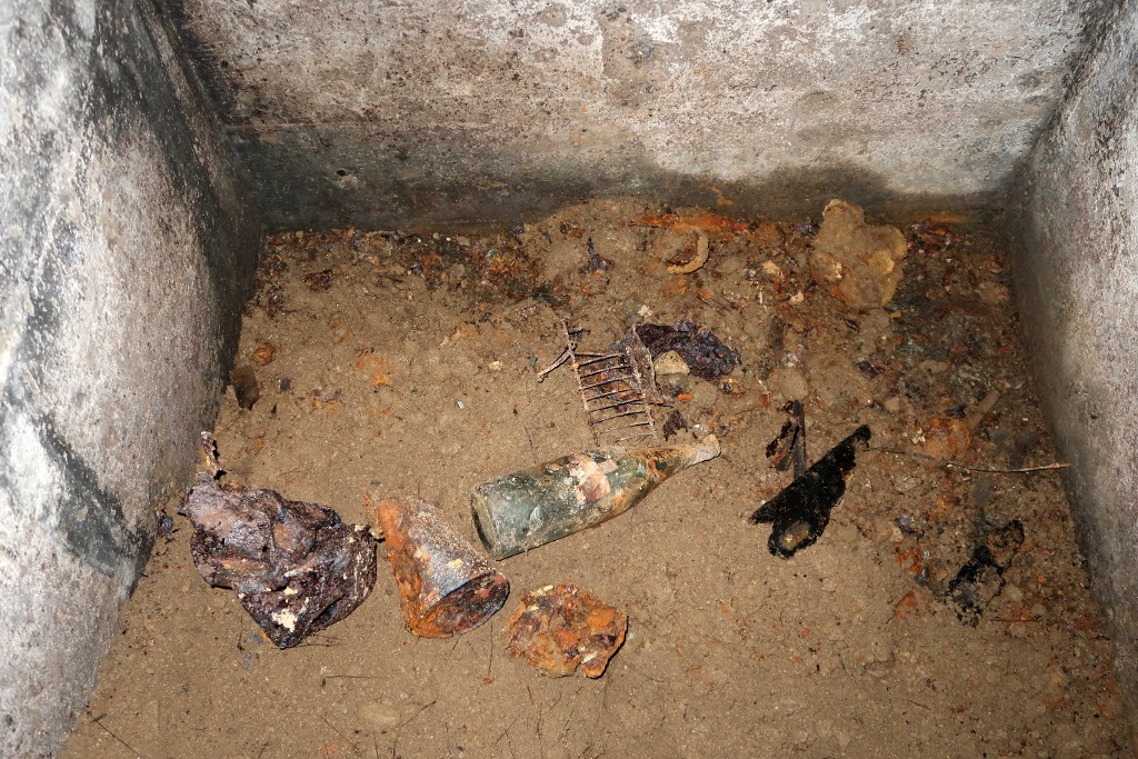 Vue de l'entrée sud remblayée : extrémité du couloir. Différents artefacts gisent au solImmatriculation