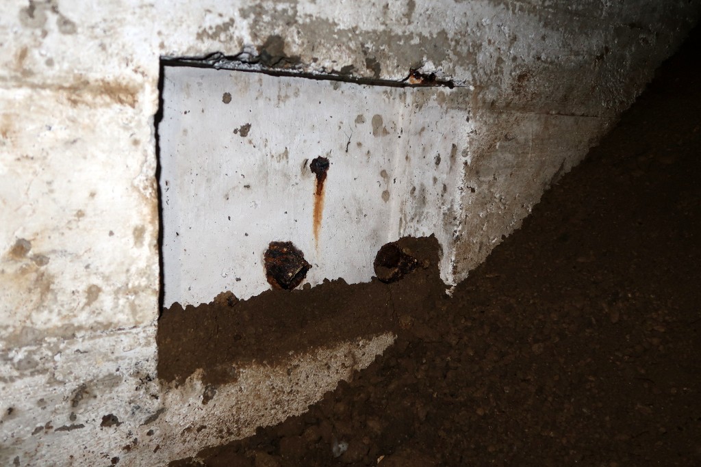 Vue du l'entrée sud remblayée : niche murale avec passage de câble (mur nord)Immatriculation