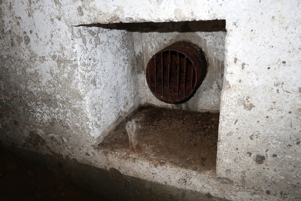 Vue de l'entrée sud remblayée : niche murale avec tuyau et sa grille de protectionImmatriculation