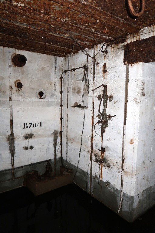 Vue intérieure : salle de garde nord, angle nord-est. Au sol, les arrivées des câbles téléphoniques du boîtier de connexion [disparu] qui était fixé au mur. Sur le mur nord se trouve peint le numéro du bunker : B 70 / 1Immatriculation