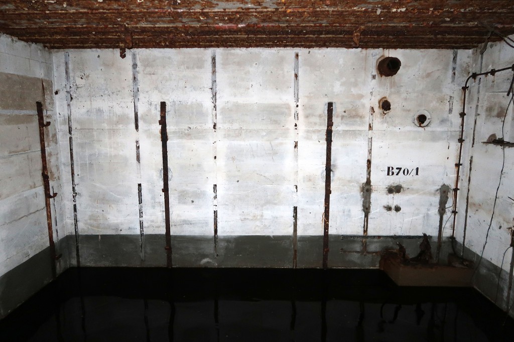 Vue intérieure : salle de garde nord, mur nord avec les supports muraux pour trois couchettes tubulaires. Sur le mur nord se trouve peint le numéro du bunker : B 70 / 1Immatriculation