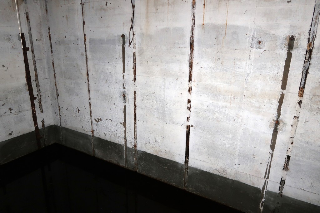 Vue intérieure : salle de garde nord, détail du mur ouest avec les supports muraux pour trois couchettes tubulairesImmatriculation