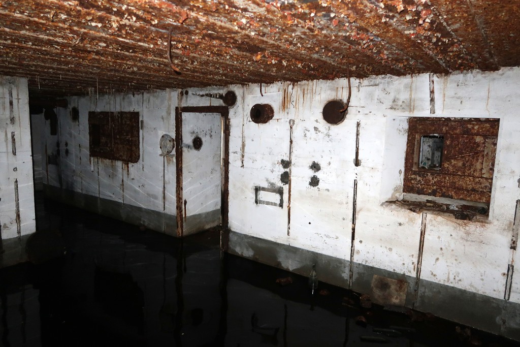 Vue intérieure : salle de garde sud. La porte débouche sur le sas. Au centre, emplacement du ventilateur [disparu] ; à droite, créneau blindé de défenseImmatriculation
