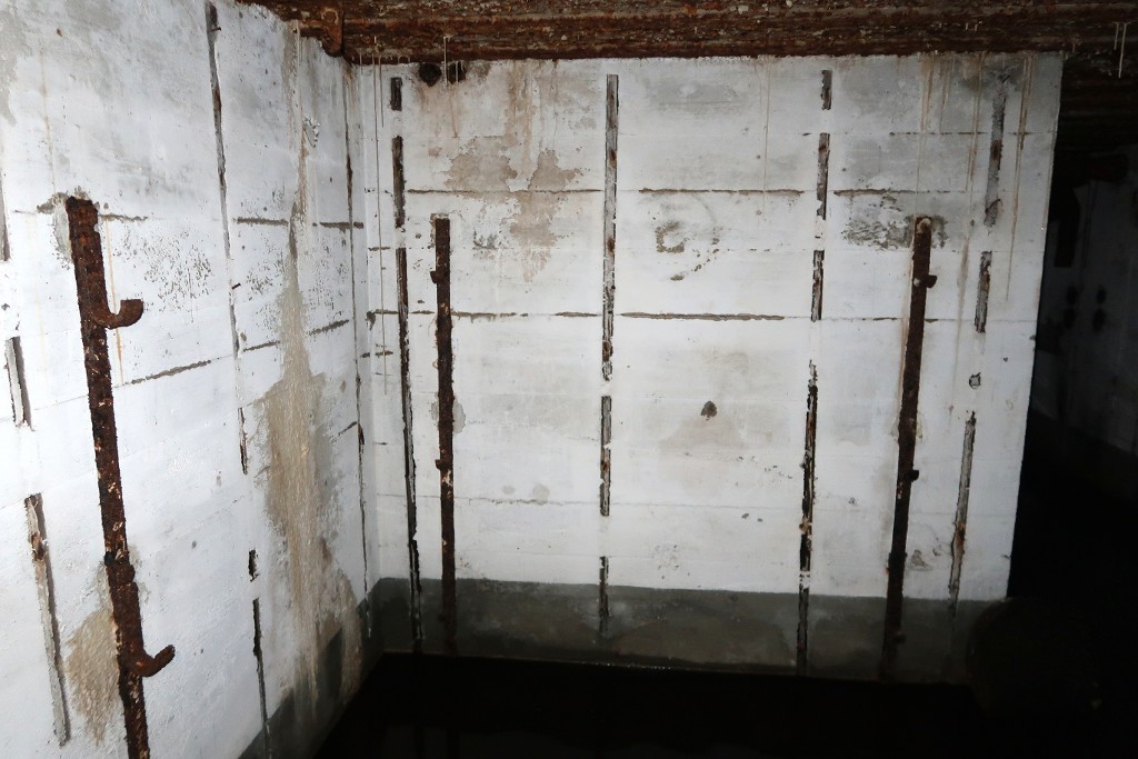 Vue intérieure : salle de garde sud, mur de refend. Il comprend des supports muraux pour trois couchettes tubulairesImmatriculation