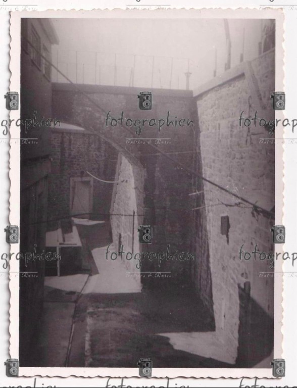 Photographie de la Marine-Flak 805 au fort du Corbeau à Plougastel, avril 1941 : cour de la redoute (collection particulière). Au-dessus de la cour, le pont d'accès à la plate-forme de la redoute et au poste de commandementImmatriculation