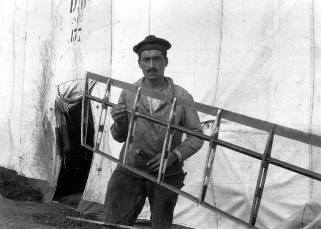 Charpentier de l'atelier aéronautique au travail : il porte une structure d'aileron (collection Daniel Dahiot - Archives départementales du Finistère, FRAD029_1NUM_007_60)Immatriculation